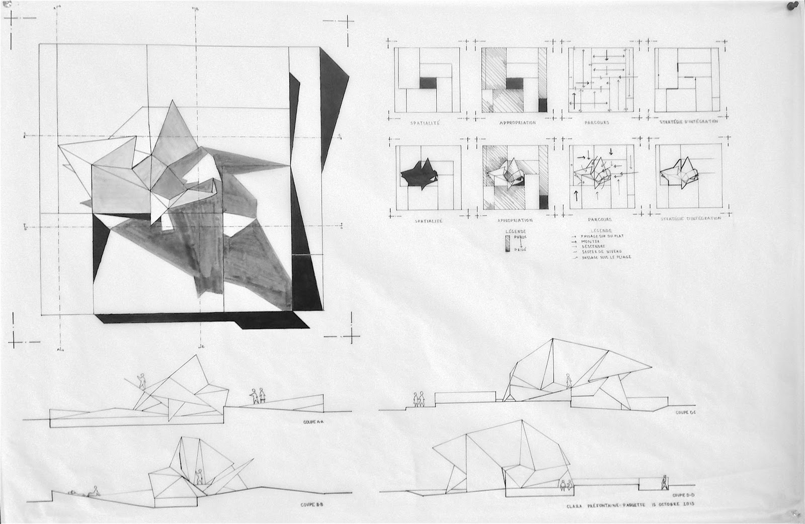 Vous disposerez les panneaux (topos 1 et pliage 2) sur les murs et les maquettes de travail essentielles a votre demarche sur les tables à dessin en correspondance avec les panneaux. N'oubliez pas de joindre aussi vos carnets de bord ( pour ceux qui ont commencé).